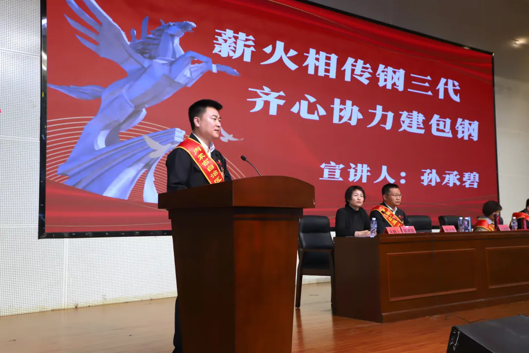 报告会上,报告团成员包钢股份动供总厂职工王明辉宣讲了刘志祥老人的故事,讲述了老一代包钢的建设者始终牢记周总理的嘱托。包钢原热电厂退管科长兼党支部书记曹凤至,描述了包钢建设初期,老一辈建设者们如何在艰苦的条件下以钢铁般的意志战天斗地的故事。包钢炼钢厂制钢三部转炉炉长孙承碧讲述了祖孙三代人接续投身包钢建设事业,见证了包钢从“一炉铁”到“百种钢”从“建设包钢”到“做强包钢”的全部过程。包钢北方稀土冶炼分公司实验员徐占宇从张文斌和他的稀土湿法冶炼创新团队如何扎根生产一线,从无到有,历经二十年探索,终于摸索出一条先进的碳酸稀土连续沉淀工艺。他们用最朴实的语言、真挚的情感、生动的示例讲述了劳动者们爱岗敬业、争创一流的典型事迹,生动展示了劳模工匠坚守初心使命、敢于担当作为的风采和品质,为现场观众带来了一堂生动的“宣讲课”。