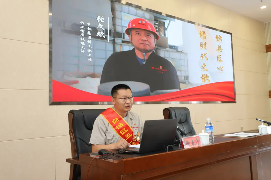 报告会上,中国兵器内蒙古北方重工业集团有限公司防务事业部407车间车工郑贵有生动分享了他如何从一名学徒工成长为一名“大国工匠”的亲身经历,同时结合习近平总书记对技术工人的要求和期待,结合自己的工作经历和成长感悟,用朴实的语言向在场的师生分享了执着坚守、匠心筑梦的奋斗故事。包钢北方稀土冶炼分公司实验员徐占宇从张文斌和他的稀土湿法冶炼创新团队如何扎根生产一线,从无到有,历经二十年探索,终于摸索出一条先进的碳酸稀土连续沉淀工艺。两位宣讲员用最真实、最质朴的方式,阐述了劳模精神、劳动精神、工匠精神的内涵,展现了劳动者的时代风采。