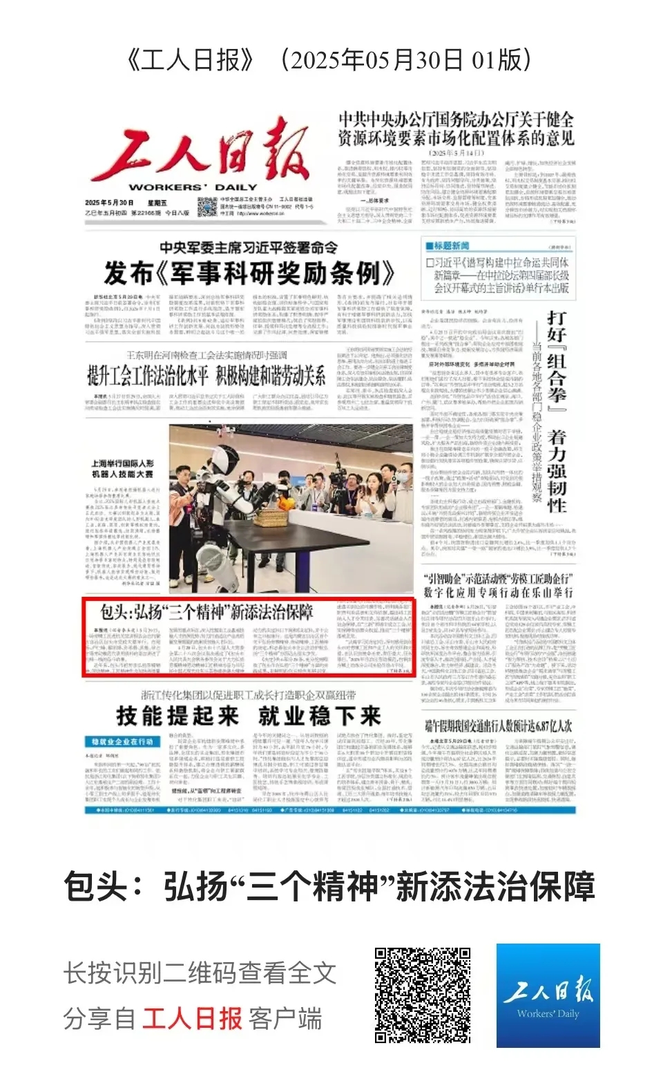 《包头:弘扬“三个精神”新添法治保障》在工人日报头版发表