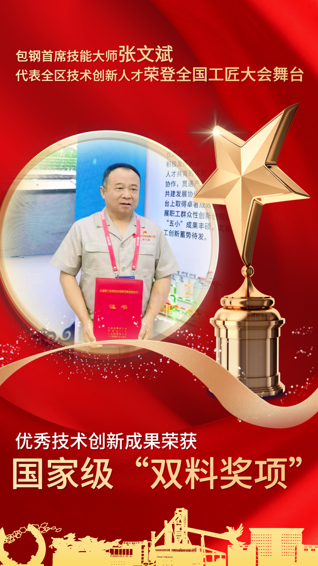包钢首席技能大师张文斌代表全区技术创新人才荣登全国工匠大会舞台 优秀技术创新成果荣获国家级“双料奖项”