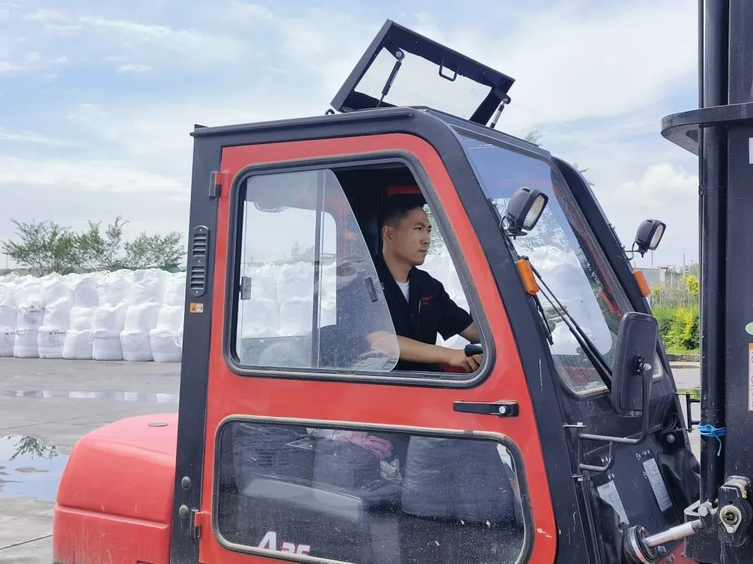 打开货叉、收臂、后倾、提升……日常拉运工作中,由于稀土产品塑料编织包装材料特殊,需要叉车在运输过程中得格外小心,每次挑运都得平、缓、稳,角度控制也需要保持住。此外,产品码放也不是随意的堆叠就可以,郭世文和工友们针对产品包装容易倾倒的问题,总结出了第一层搭建稳固“地基”,第二层从两边往中间摆放,第三层从中间往两边摆放的工作方法,这样就可以保证产品安全放置不发生倾倒。
