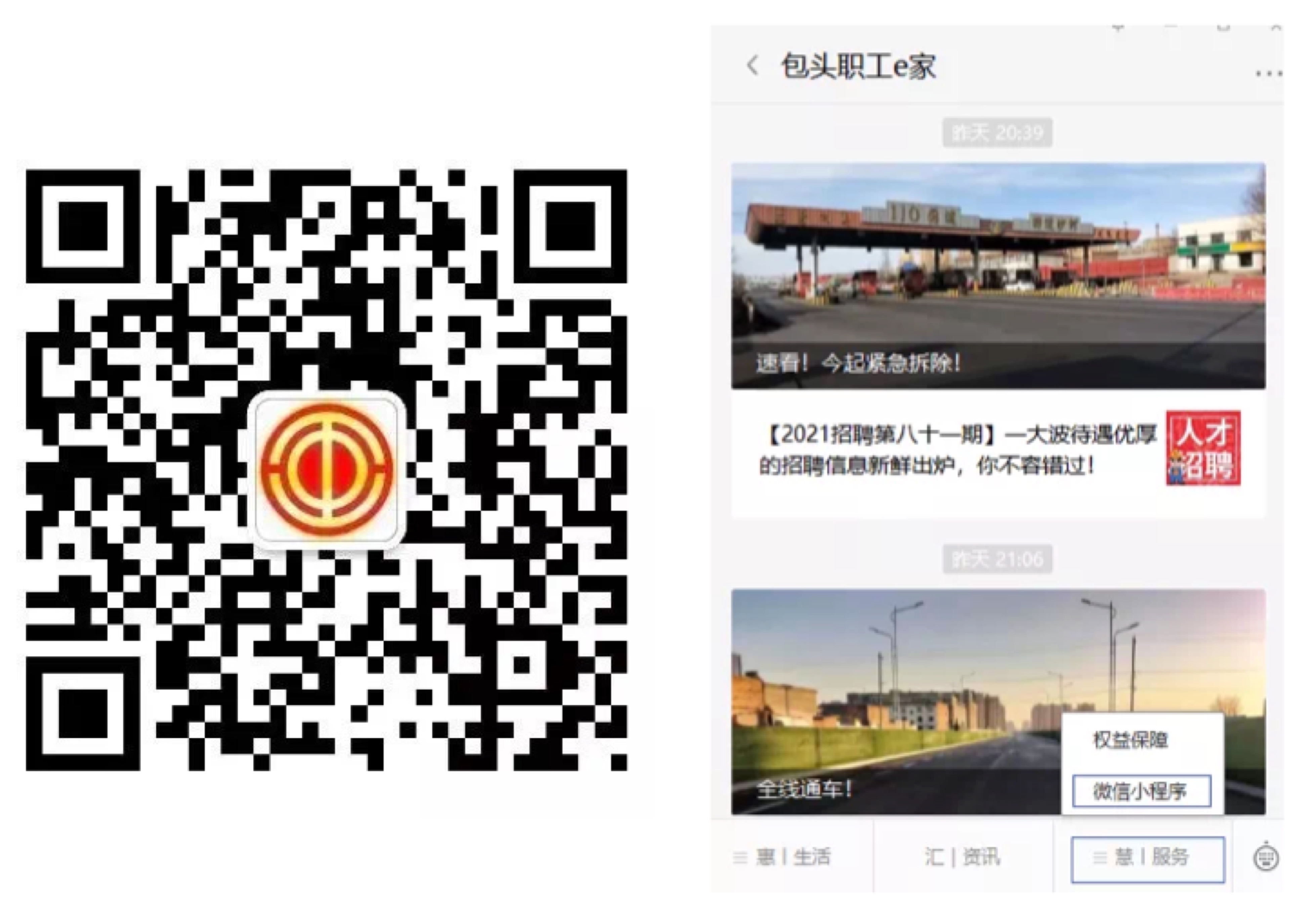 长按识别下方二维码或微信搜索“包头职工e家”,关注“包头职工e家”微信公众号,点击菜单“慧丨服务”中“微信小程序”即可进入微信小程序