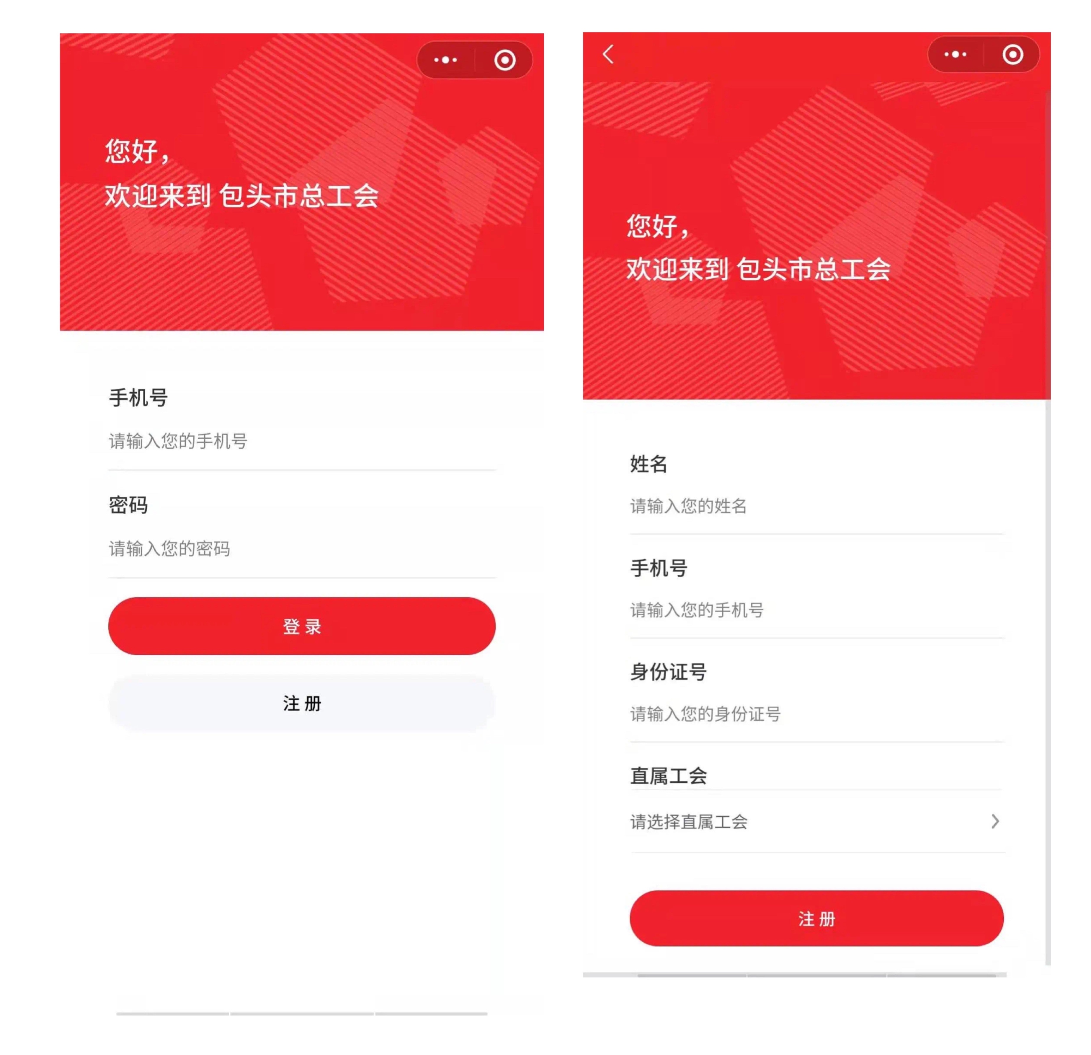 2、如果您是已经录入过会员实名制信息的职工,用预留的手机号码登录。用户输入实名制录入预留的手机号及密码(身份证后六位)即可登录,登录后请及时修改密码。如果您还没有实名制会员信息录入或实名制录入信息有误,那就选择“注册”,输入“姓名+手机号+身份证号+直属工会”等信息,即可完成小程序注册。
