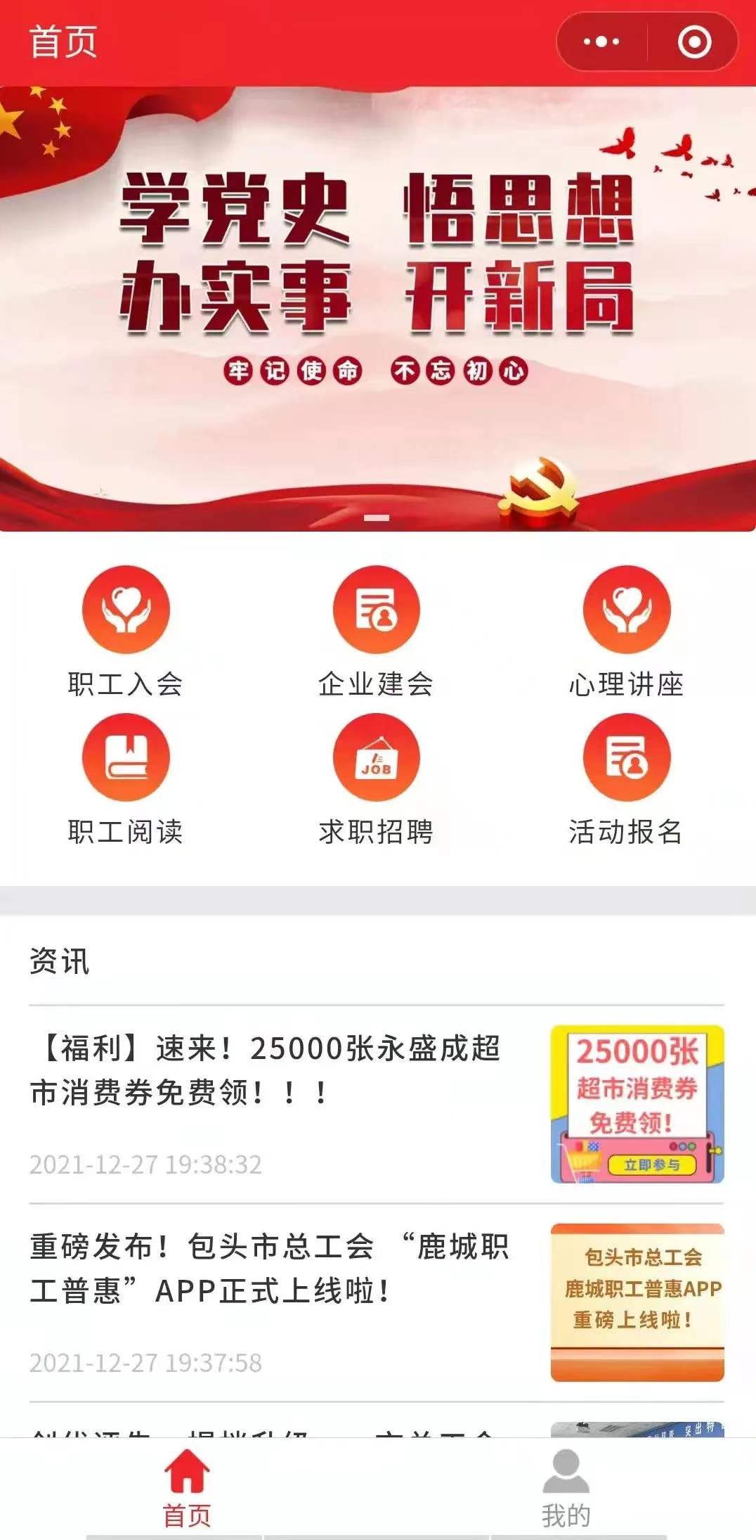 包头市总工会微信小程序首页包括【职工入会】、【企业建会】、【心理讲座】、【职工阅读】、【求职招聘】、【活动报名】等模块。
