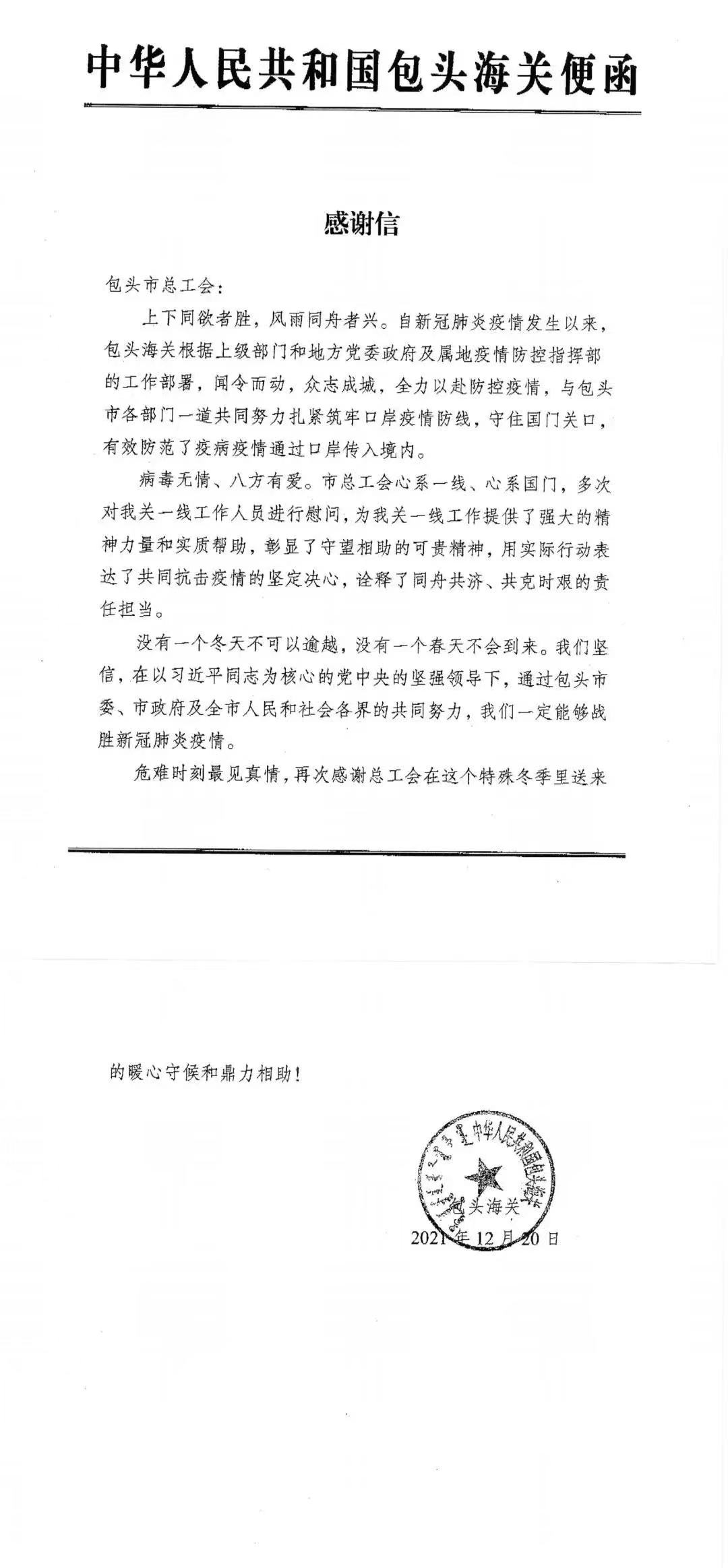 市总工会慰问疫情防控人员 包头海关送来感谢信