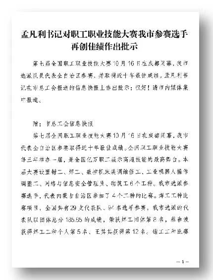 孟凡利书记对我市选手在第七届全国职工职业技能大赛上获得佳绩做出指示,要求市内媒体集中宣传报道。