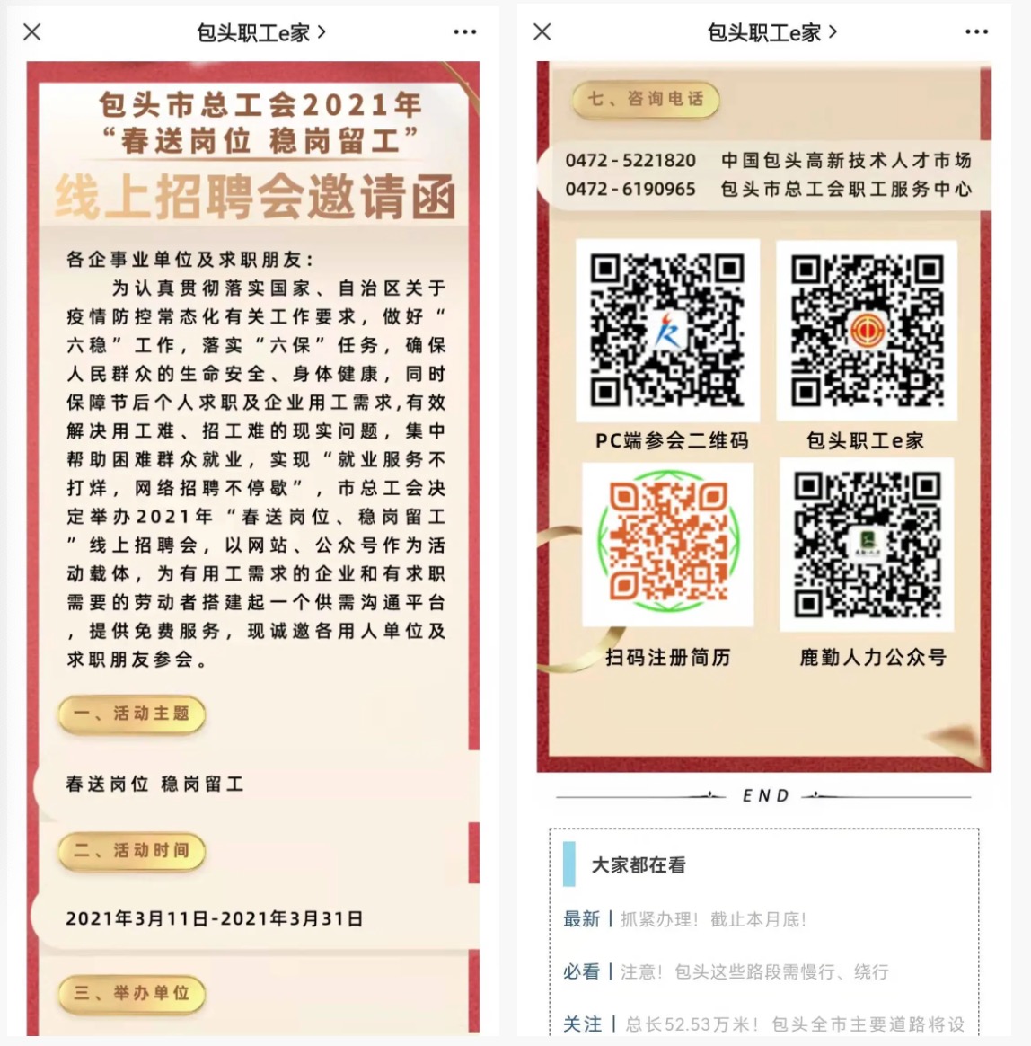 扎实推进工会常态化就业服务,联合高新人才市场举办“春送岗位、稳岗留工”线上招聘会,帮助56家企业开展招聘,为953名求职人员提供就业服务,联合市就业局等单位主办“春风行动”网络招聘会,在包头职工e家发布就业信息75期,阅读量10.85万人次。