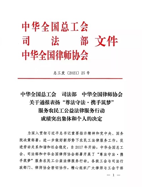 近日,中华全国总工会、司法部、中华全国律师协会发布《中华全国律师协会关于通报表扬“尊法守法·携手筑梦”服务农民工公益法律服务行动成绩突出集体和个人的决定》(总工发〔2021〕25号),对全国2017-2020年开展“尊法守法· 携手筑梦”服务农民工公益法律服务行动成绩突出的147个集体和299名个人予以通报表扬。包头市总工会荣获成绩突出集体。