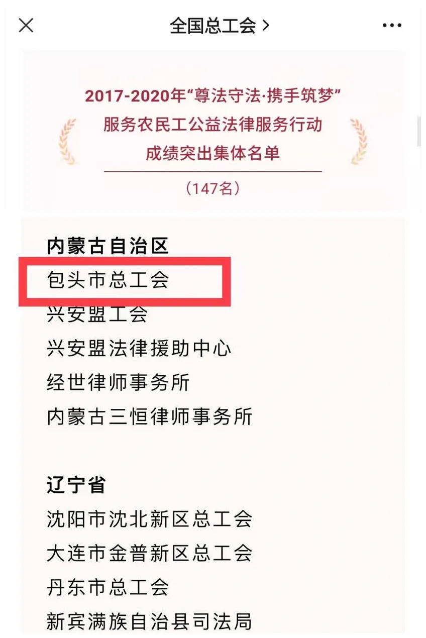 喜讯!包头市总工会荣获全国“尊法守法·携手筑梦” 服务农民工公益法律服务行动成绩突出集体