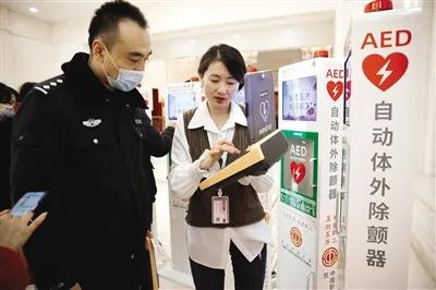 “看环境、无反应,拍双肩、大声唤,听呼吸、摸脉搏,快救人、心按压……”伴随着解说词,技术人员通过模拟人演示着心肺复苏的流程和步骤,并按照除颤器的提示将电极片贴至模拟人胸部位置。随后,听从语音提示等待着按下除颤器指示灯。