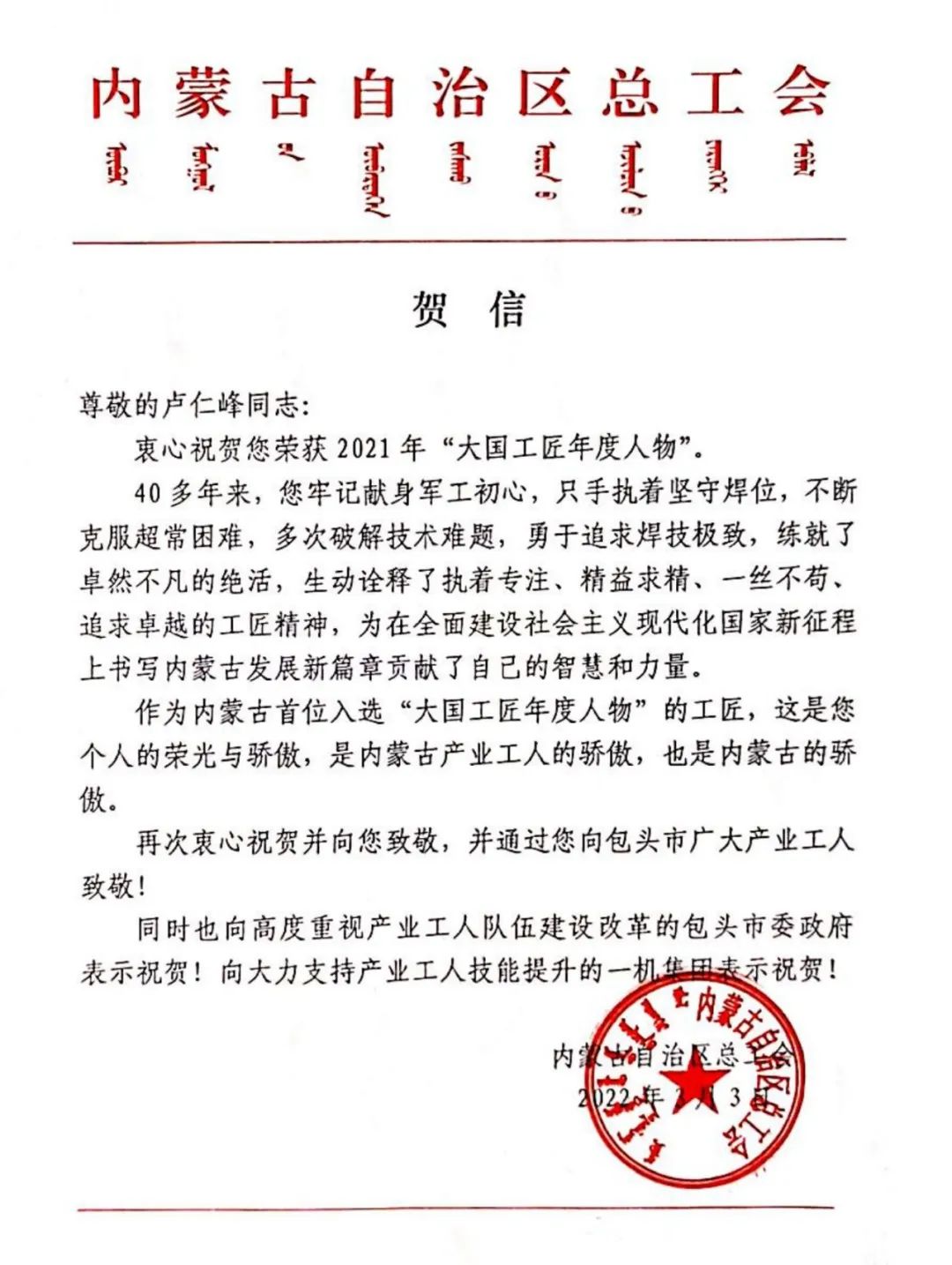40多年来,您牢记献身军工初心,只手执着坚守焊位,不断克服超常困难,多次破解技术难题,勇于追求焊技极致,练就了卓然不凡的绝活,生动诠释了执着专注、精益求精、一丝不苟、追求卓越的工匠精神,为在全面建设社会主义现代化国家新征程上书写内蒙古发展新篇章贡献了自己的智慧和力量。