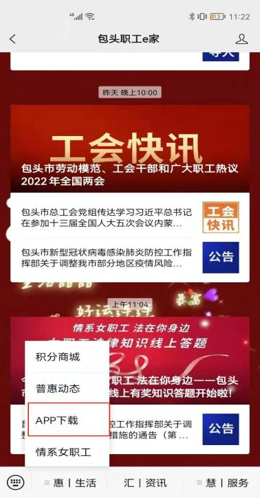 关注“包头职工e家”微信公众平台,点击菜单“惠|生活”下载“鹿城职工普惠APP”
