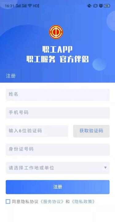 点击注册(输入工会、姓名、手机号码、验证码、身份证号)