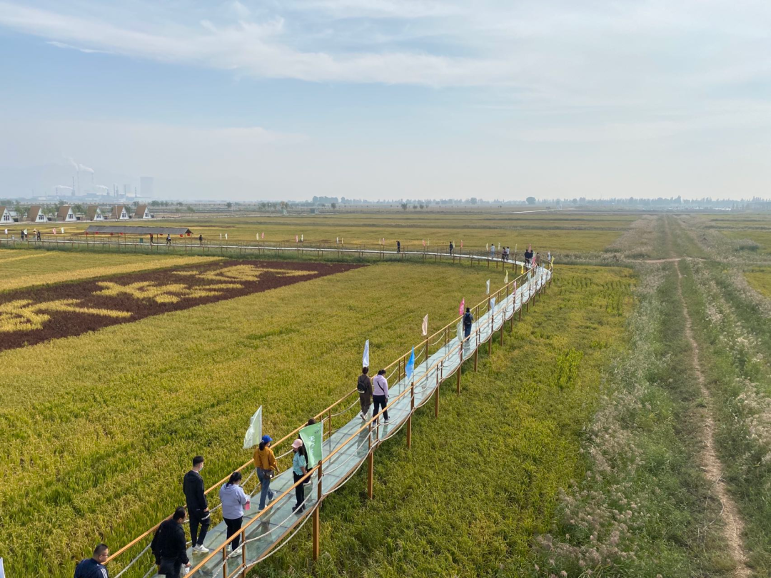 满目金黄惹人醉,来到天禾生态农庄,职工们漫步在透明玻璃栈道上观摩稻禾勾勒出的稻田画,沉浸在“稻浪滚滚,白鹭低飞,蟹鱼戏游,花草飘香”的意境中,感悟包头新农村的新变化,感受丰收喜悦。