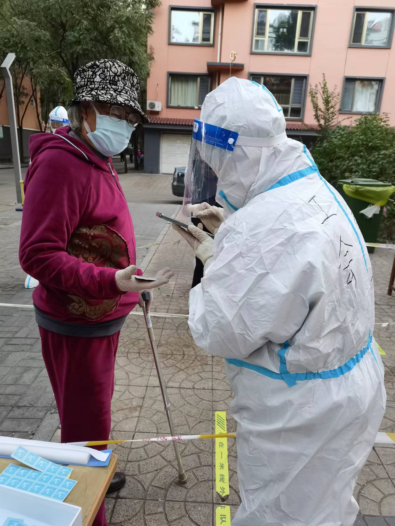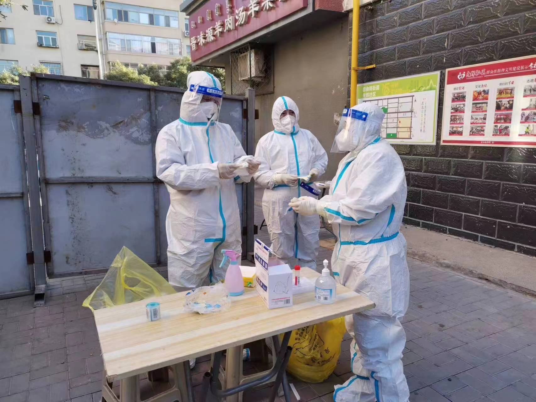10月10日,在光辉社区核酸采集点,身穿防护服、手拿小喇叭的市总工会青山区第二志愿小队的工会干部站在队伍前维持秩序。不远处,其他两名工会干部正协助医护人员准备物品,并忙着登记核酸检测采样信息。