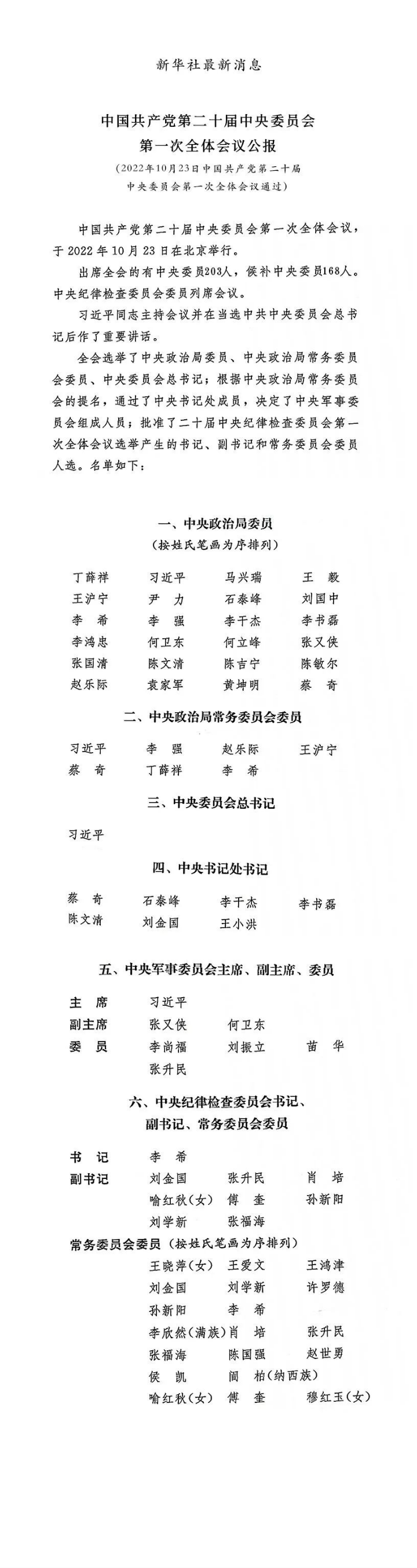中国共产党第二十届中央纪律检查委员会委员名单