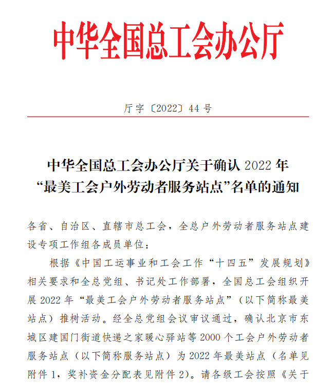 喜报!8个!我市户外劳动者驿站荣获中华全国总工会2022年“最美工会户外劳动者服务站点”
