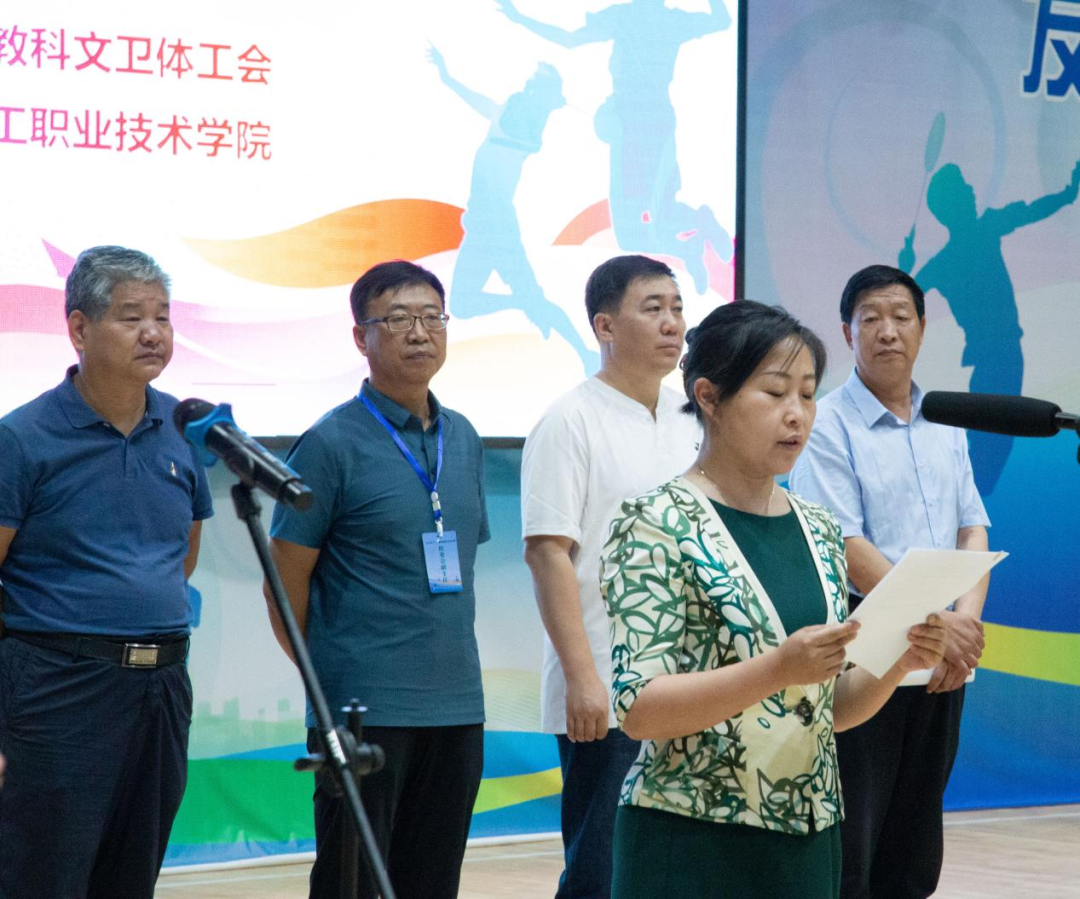6月17日上午,在包头轻工职业技术学院体育馆举行开幕式,市总工会党组书记、副主席李琼,市总工会党组成员、二级调研员米斌,市教科文卫体工会负责人以及包头轻工职业技术学院、内蒙古农业大学职业技术学院、包头医学院、包头师范学院、包头铁道职业技术学院、包头钢铁职业技术学院的领导参加了开幕式。