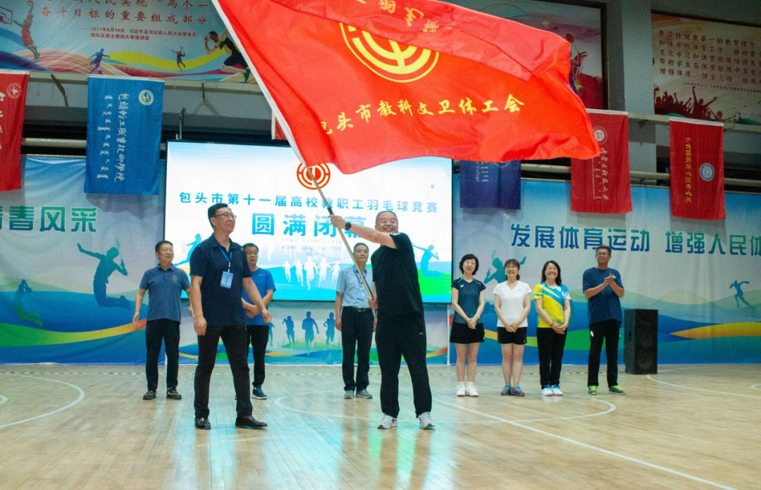 闭幕式颁奖结束后,自治区教科文卫体工会兼职副主席、市教科文卫体工会主席陆欣向包头职业技术学院工会主席刘向杰授赛旗,包头市第十二届高校教职工羽毛球竞赛将由包头职业技术学院工会承办。