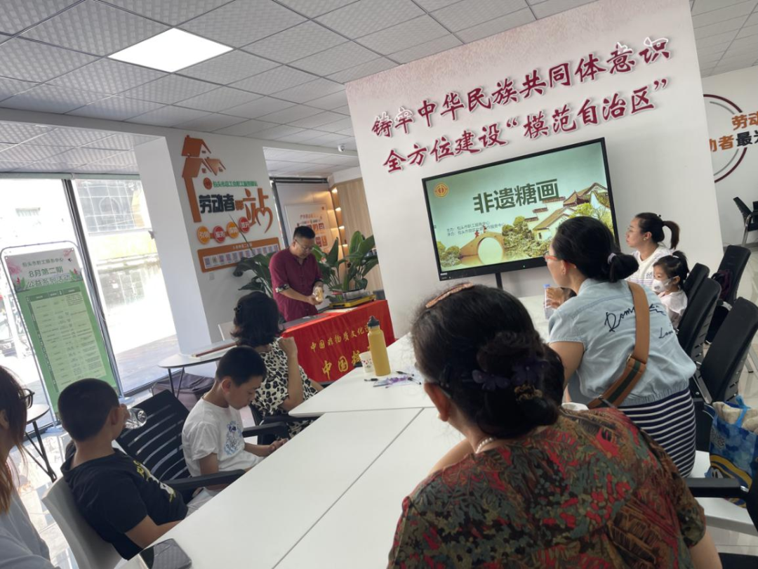 服务驿站邀请糖画传承人张建国老师,为职工家庭展示了糖画的精湛技艺,如快速绘制、细节处理等,让孩子们赞叹不已。家长和孩子们全身心投入到了这场糖画艺术的盛宴中,在老师的指导下,孩子们开始动手实践。他们小心翼翼地用小勺舀出适量的糖浆,然后在铁板上尽情挥洒,不一会儿,一幅幅精美的糖画作品逐渐成形。