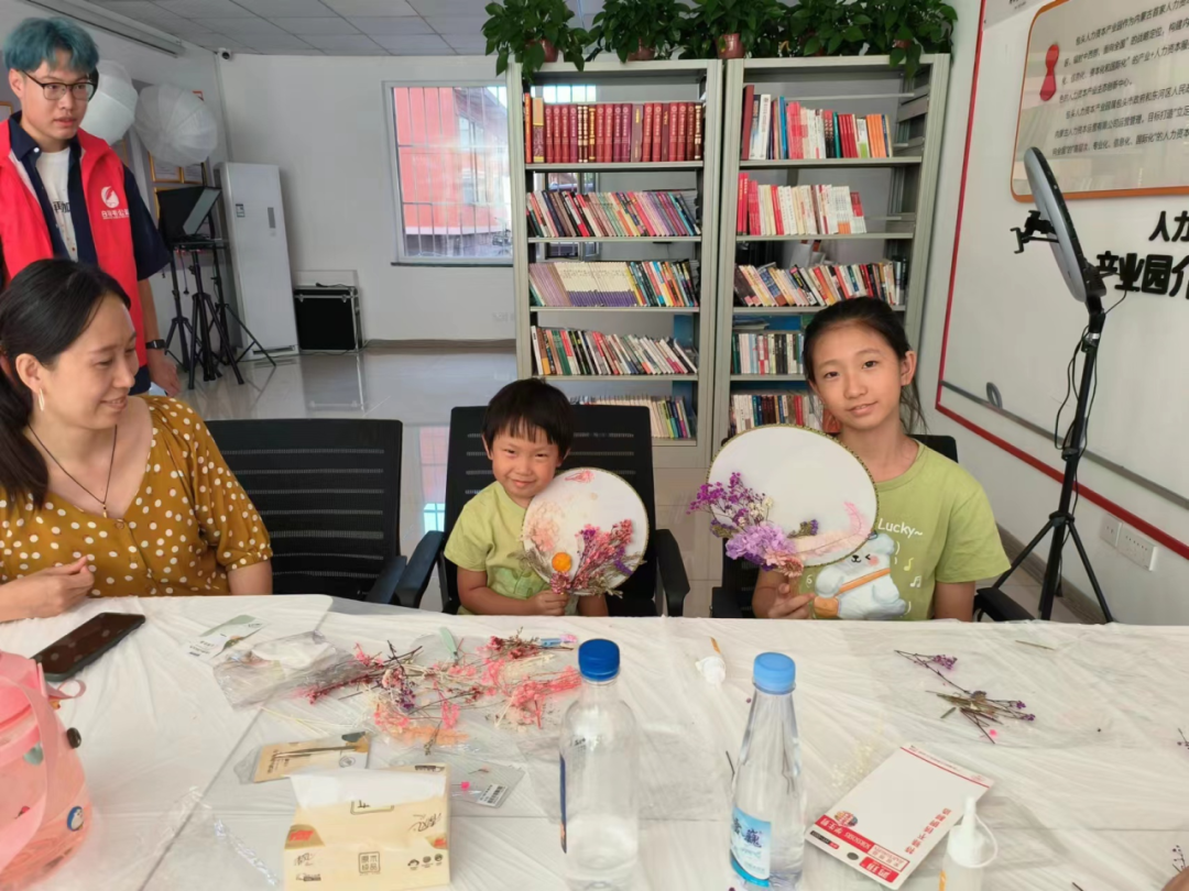 活动开始,志愿者首先向大家介绍了团扇的文化背景及制作方法。团扇,又称宫扇、纨扇,是中国汉族传统工艺品及艺术品,是一种圆形有柄的扇子,它代表着团圆友善、吉祥如意。团扇扇面有缂丝的、刺绣的,不同工艺各司其职,使得团扇变化多样,趣味无穷。随后,工作人员向大家发放了空白团扇和各种干花,带领大家亲手体验“画扇”乐趣。