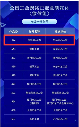 今年9月“包头职工e家”微信公众号,被评为“包头市优秀政务类新媒体账号”称号。此次,“包头职工e家”又获评全国总工会“网聚职工正能量 争做中国好网民”主题活动市级“十佳”平台称号。同时“包头职工e家”长居全国地市级工会新媒体传播力排行榜前50,在内蒙古自治区工会系统排行榜中位列前茅。
