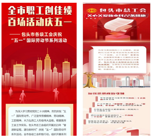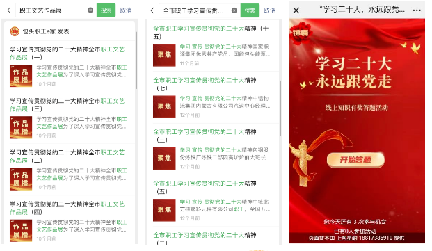 加强职工思想政治建设,坚定理想信念,是工会宣传工作的重中之重。包头市总工会在职工红色教育和思想引领中走在前作表率,创新方式方法,亮点纷呈。为深入学习宣传贯彻党的二十大精神,包头市总工会在“包头职工e家”微信公众号上开设“学习宣传贯彻党的二十大精神”专题板块,在党的二十大期间全天候全时段开启网上宣传,及时为职工送去权威资讯。同时为营造学习宣传贯彻党的二十大精神的浓厚氛围,推动党的二十大精神深入职工、深入一线,在专题板块中进行【学习宣传贯彻党的二十大精神全市职工文艺作品展】、【全市职工学习宣传贯彻党的二十大精神】、【“学习二十大,永远跟党走”线上答题活动】等多项专题活动,引导广大干部群众深入学习党的二十大报告和党章,认真领悟党的二十大提出的新思想新论断、作出的新部署新要求,推动党的二十大精神广泛深入,团结动员我市百万职工发挥主力军作用。相关微信文章阅读人次近8万,二十大线上答题活动参与人数达3000人。