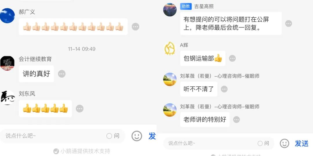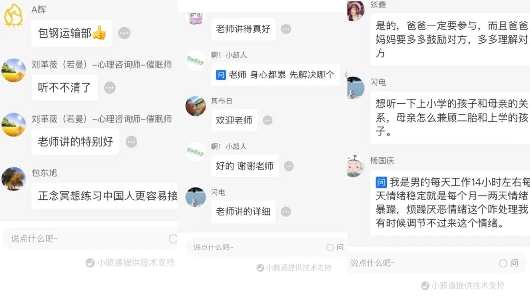 活动设立职工实时在线互动环节,累计观看人次1500余人,互动环节职工就困扰自身的心理问题与老师进行沟通交流,老师在线耐心为职工解惑,教授大家舒缓压力和减轻焦虑的方法技巧,赢得职工好评。职工纷纷表示,降彩虹老师帮助大家就自身存在的心理健康问题答疑解惑、一定程度上减轻了心理压力、缓解了工作及生活中焦虑紧张的不良情绪,讲授内容说到了职工心坎上,表示这堂课是新时代特点下符合职工学习需求、内容实在、职工喜闻乐见的培训讲座,是职工互助保障活动更贴近广大职工、深化服务职工群众的重要体现。
