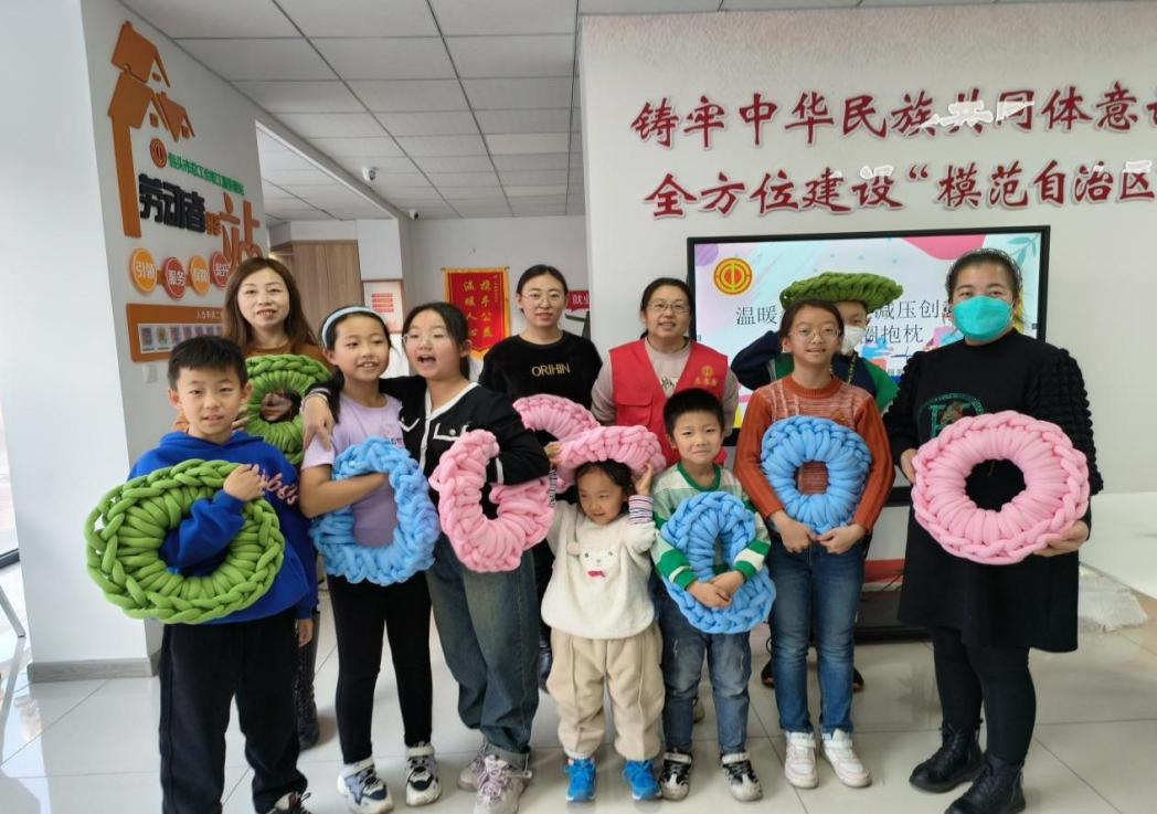 此次活动共邀请10组职工家庭参与甜甜圈手工抱枕编织活动,驿站工作人员为每组职工家庭都精心准备了编织材料,在编织老师的耐心讲解和指导下,各职工家庭陆续投入到手工编织中,通过这种轻松解压的方式感受手工制作的乐趣。