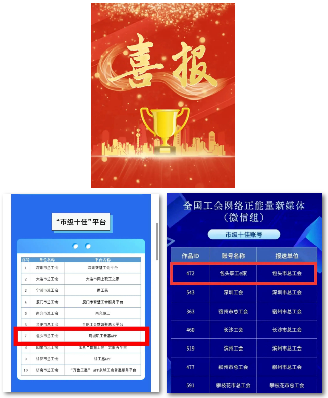 市总工会连续12年被全总评为全国市级工会财务会计先进单位。我市联系引导社会组织工作在第一届全国工会联系引导社会组织工作创新活动评选中取得全国第六名的好成绩。承办内蒙古自治区劳动关系协调员职业技能比赛,包头市代表队夺得冠军并代表内蒙古参加全国竞赛,创下自治区参赛历史最好成绩。“鹿城职工普惠”APP荣获全国互联网+工会普惠服务“市级十佳”平台,“包头职工e家”微信公众号获评全国工会优秀新媒体市级十佳账号。全国工会户外劳动者服务站点建设微视频展播获第二名。