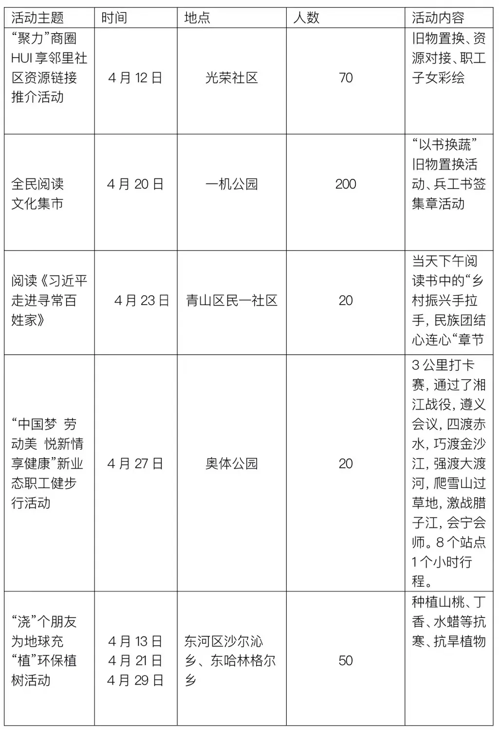 4月12日在光荣社区举办“聚力”商圈 HUI享邻里社区资源链接推介活动。本次活动提供旧物置换、资源对接、职工子女彩绘等服务,参与的职工人数达70人。现场旧物置换30余笔,帮助职工解决旧物闲置难题,提高环保意识。