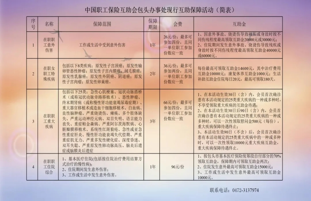 职工互助保障工作是在包头市总工会领导下开展的一项从事以职工医疗健康为核心、以职工互助互济为基本形式、以公益非盈利为特点的职工服务工作。主要目的是通过各级工会将广大职工组织起来,在职工患病时以低额会费实现高额保障,形成“无病我帮人,有病人帮我”的服务模式,真正实现“小会费、大保障”的服务宗旨,从而达到在一定程度上缓解职工因患病治疗造成经济困难的保障目的。