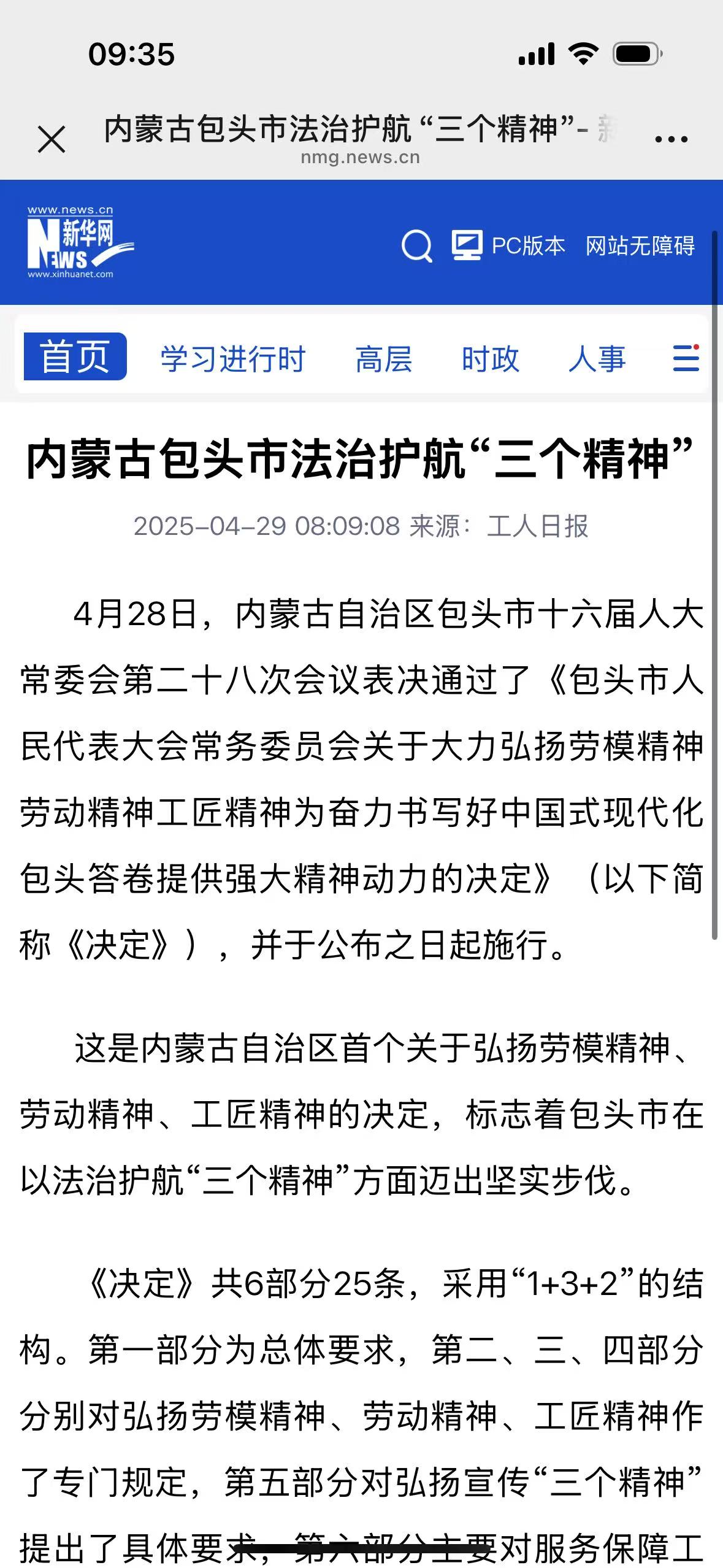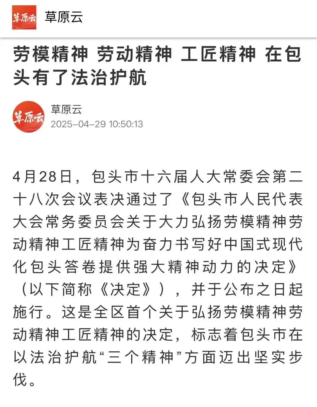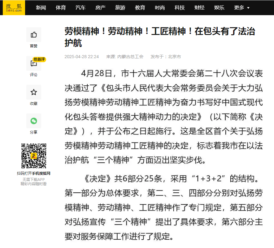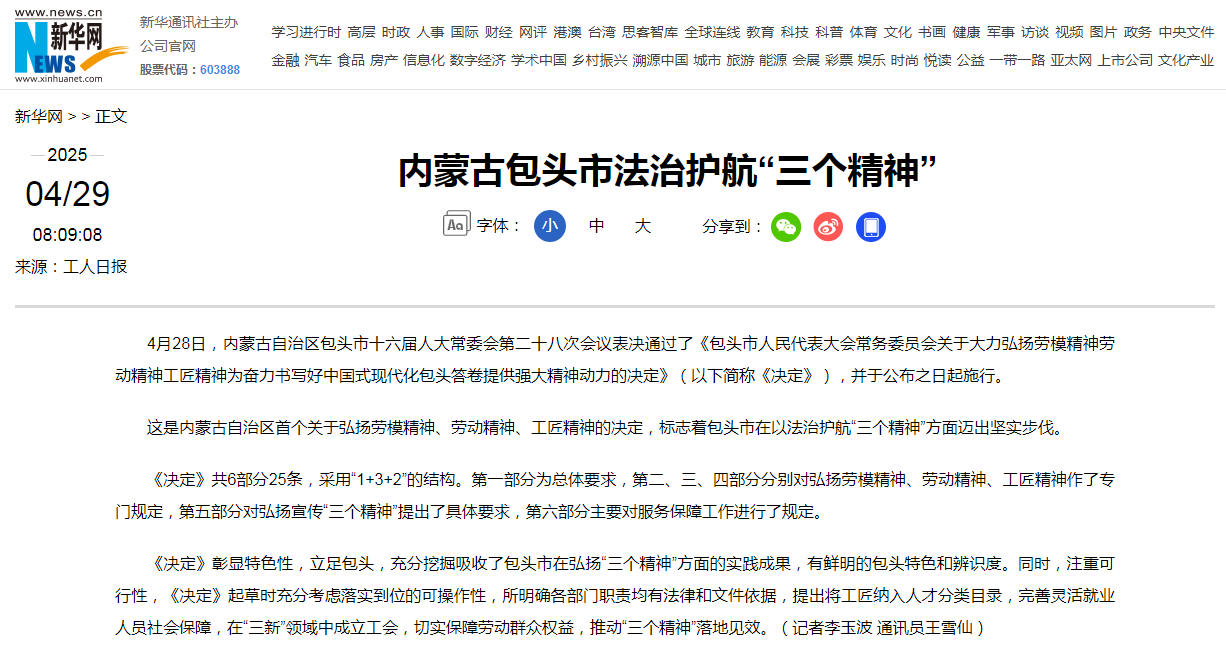 4月28日,市十六届人大常委会第二十八次会议表决通过了《包头市人民代表大会常务委员会关于大力弘扬劳模精神劳动精神工匠精神为奋力书写好中国式现代化包头答卷提供强大精神动力的决定》(以下简称《决定》),《决定》的通过引发了广泛关注,工人日报、新华网等各大官媒纷纷进行转发。
