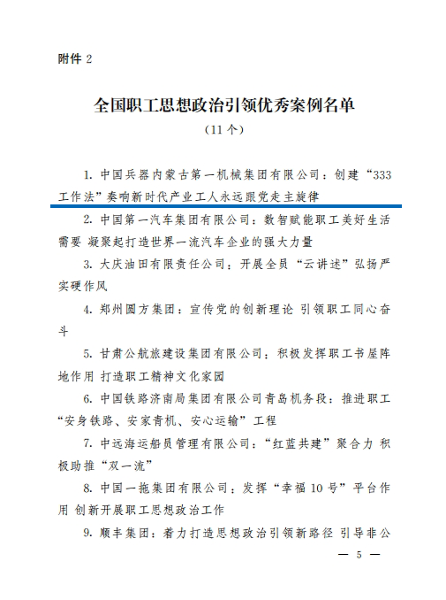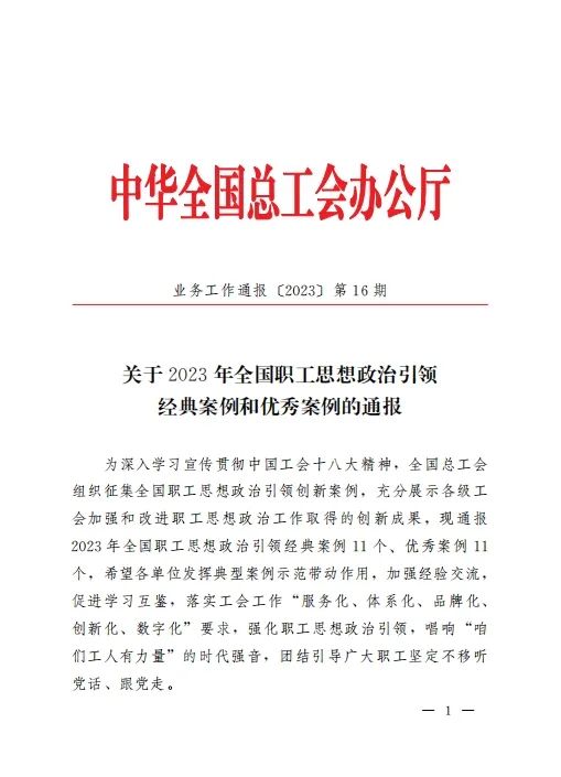 为深入学习宣传贯彻中国工会十八大精神,充分展示各级工会加强和改进职工思想政治工作取得的创新成果,强化职工思想政治引领,唱响 “咱们工人有力量”的时代强音,团结引导广大职工坚定不移听党话、跟党走,近日,全国总工会通报2023年全国职工思想政治引领经典案例和优秀案例评选活动获奖名单,一机集团“创建333工作法 奏响新时代产业工人永远跟党走主旋律”一文获评“全国职工思想政治引领优秀案例”,是全区唯一一家获评单位。