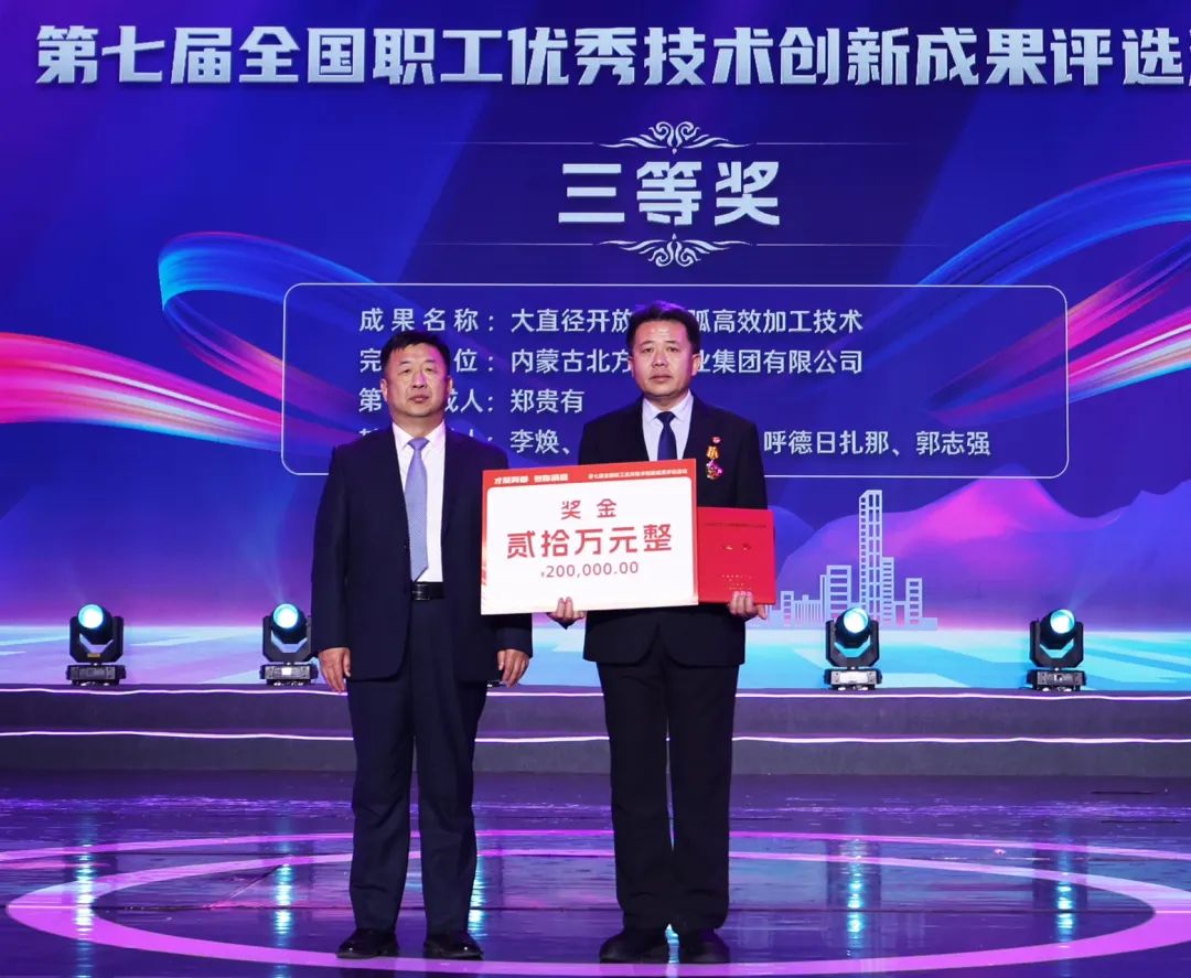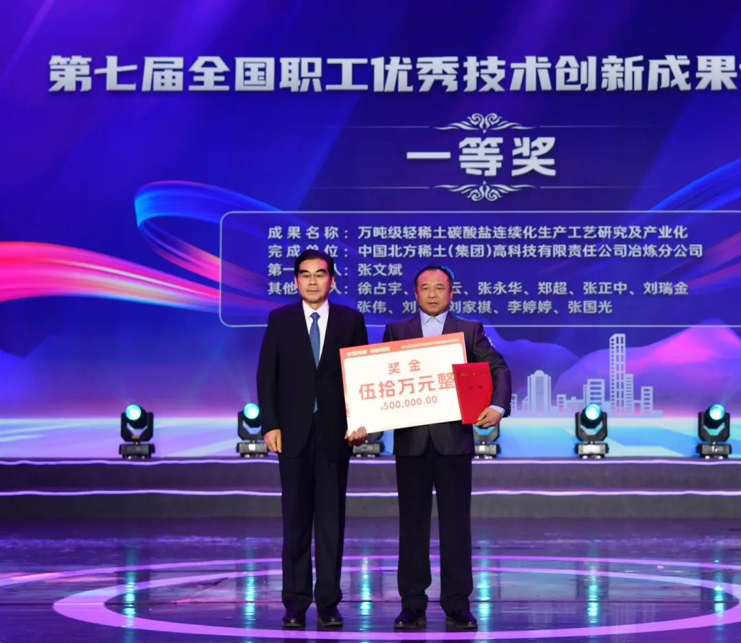 在今年第七届全国职工优秀技术创新成果评选活动中,包头市总工会精心选拔、积极申报的两个项目取得了历史最好成绩。稀土项目《万吨级轻稀土碳酸盐连续化生产工艺研究及产业化》获得一等成果,装备制造类项目《大直径开放式齿弧高效加工技术》获得三等成果。活动现场,自治区党委常委、市委书记丁绣峰为一等成果第一完成人张文斌,自治区总工会党组书记、副主席张慧宇为三等成果第一完成人郑贵有颁奖。