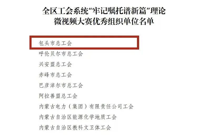 近日,由自治区总工会举办的全区工会系统“牢记嘱托谱新篇”理论微视频大赛,经过择优推荐、组织评选等程序,包头市总工会荣获优秀组织单位。