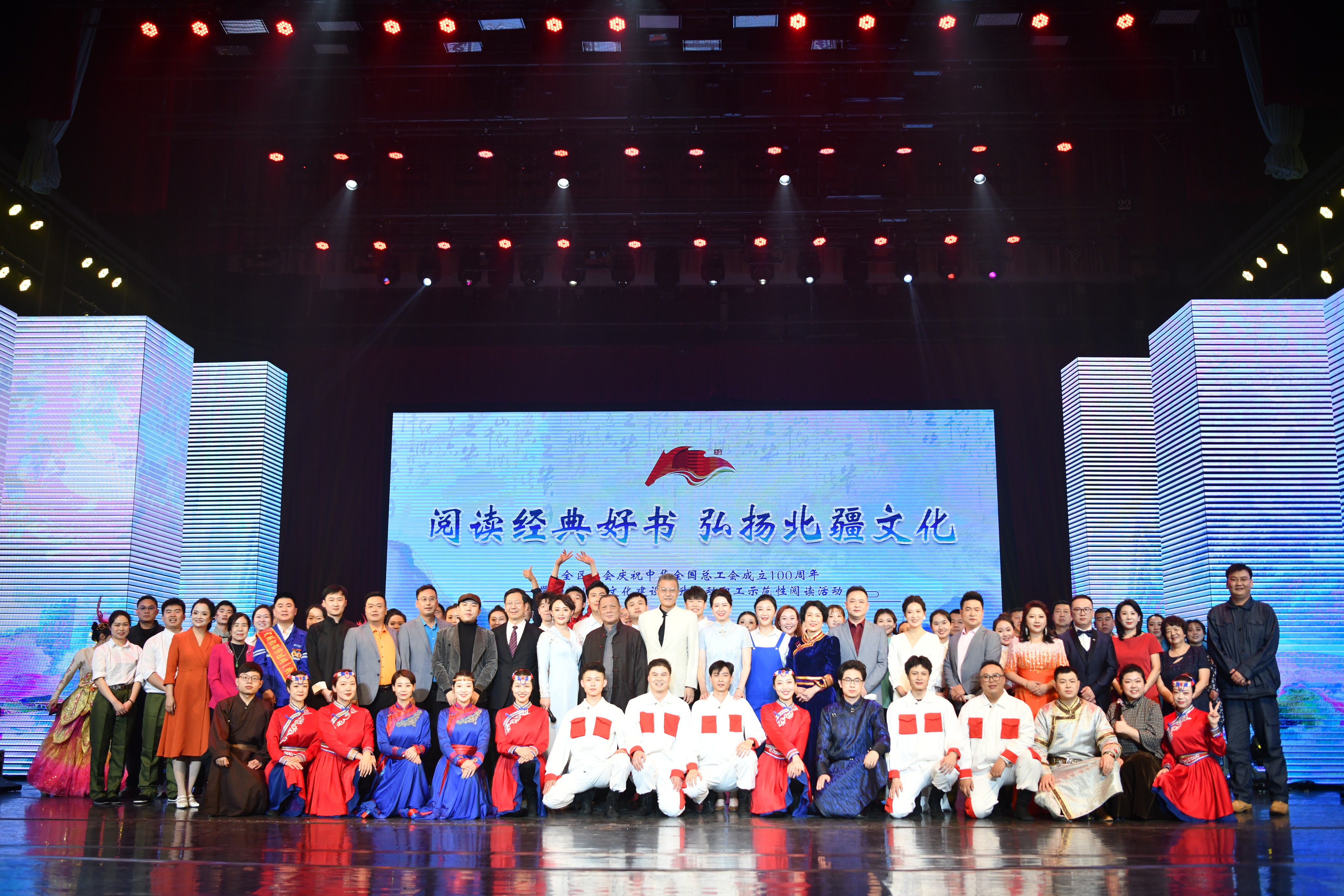 随后,在包头市第一工人文化宫进行了读书分享展演活动,全市各行各业职工代表500余人现场参加活动。自治区总工会党组成员、副主席邬兴宇致辞。北重集团全国劳动模范郑贵有宣读了读书倡议书。“天苍苍,野茫茫,风吹草地现牛羊”在稚嫩的童声诵读经典《敕勒歌》中拉开帷幕。示范性阅读活动分为《文化传承、红色觉醒》《钢花飞溅、工业繁荣》《民族融合、守望相助》《稀土之都、风光无限》四个篇章。读书分享《走西口与包头》巧妙地以时间线串联起漫长历史,情景表演《觉醒》演绎出在党的正确领导下内蒙古工人运动的辉煌历程。音乐情景剧《齐心协力建包钢》重现了火红年代的历史佳话。访谈《三千孤儿入内蒙》和阅读分享《梦里依稀慈母泪》向大家叙述了中华民族一家亲的难忘经历。在全场观众和演职人员齐声合唱《歌唱祖国》的雄浑歌声中,展演落下帷幕。展演活动通过全息投影、诗歌朗诵、图书分享、座谈交流、情景剧演绎、音舞诗画等丰富多样的艺术形式深刻诠释了北疆文化的丰富内涵,全面展现全区各民族交往交流交融的历史进程以及文化建设所取得的辉煌成就。