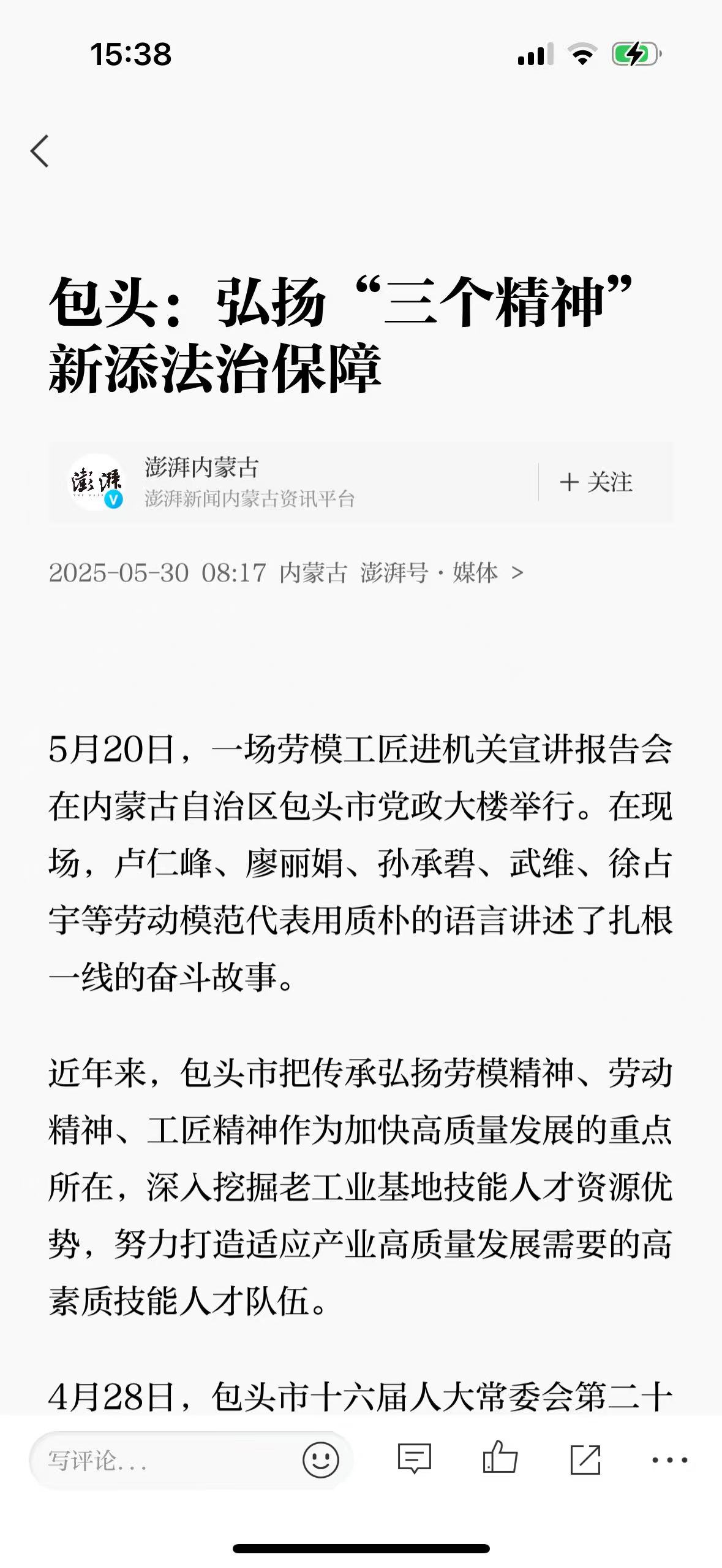 4月28日,市十六届人大常委会第二十八次会议表决通过了《包头市人民代表大会常务委员会关于大力弘扬劳模精神劳动精神工匠精神为奋力书写好中国式现代化包头答卷提供强大精神动力的决定》(以下简称《决定》),并于公布之日起施行。这是全区首个关于弘扬劳模精神劳动精神工匠精神的决定,标志着我市在以法治护航“三个精神”方面迈出坚实步伐。《决定》发布后引起了新华网、人民网、中工网等国家级媒体的广泛报道。