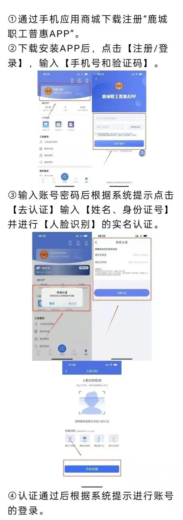 1.打开鹿城职工普惠APP,完成登录与实名认证。