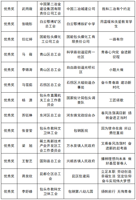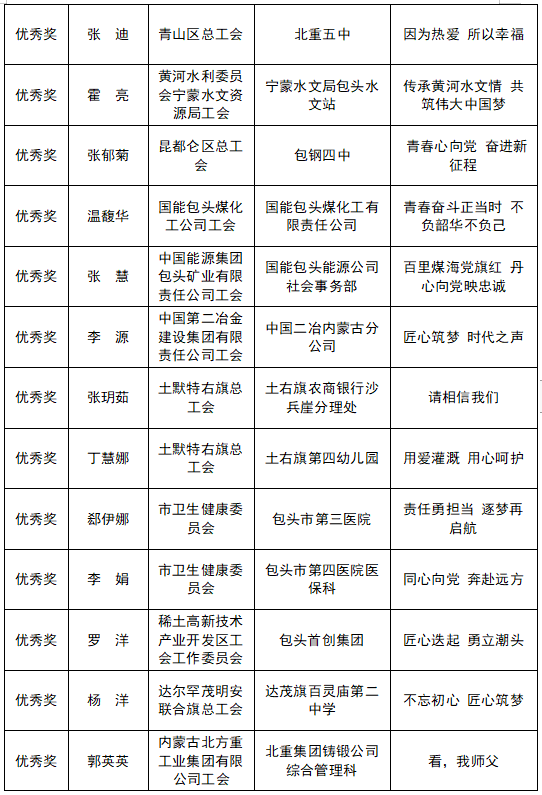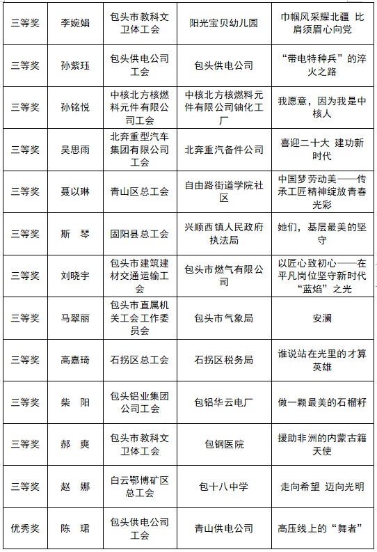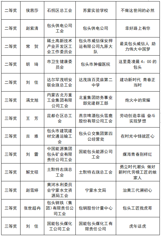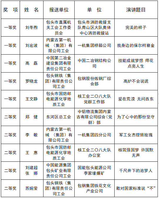 为了进一步引导广大职工坚定理想信念,立足本职建功立业,市总工会组织开展了全市职工演讲比赛,全市各直属工会积极响应,开展了多种形式的比赛和选拔,共上报了76个参赛作品。比赛中,参赛选手结合自己或身边同志们工作和成长经历,讲述了学习贯彻习近平新时代中国特色社会主义思想的体会、感受,讲述了大国工匠等各级劳动模范和先进人物辛勤劳动、创造性劳动的感人事迹,讲述了我市广大职工在打造“工匠之都”,建设新时代中国特色社会主义现代化新包头的进程中不懈奋斗的生动故事。选手们或激情澎湃,或含情脉脉,或晓之以理,或动之以情,讲述了劳动者奋斗的精彩故事,描绘了用劳动书写新时代的精彩篇章。通过精彩的角逐,来自包头市消防救援支队的刘冬煦等5名选手获得一等奖。此次比赛选拔出的优秀选手将代表我市参加全区职工演讲比赛。